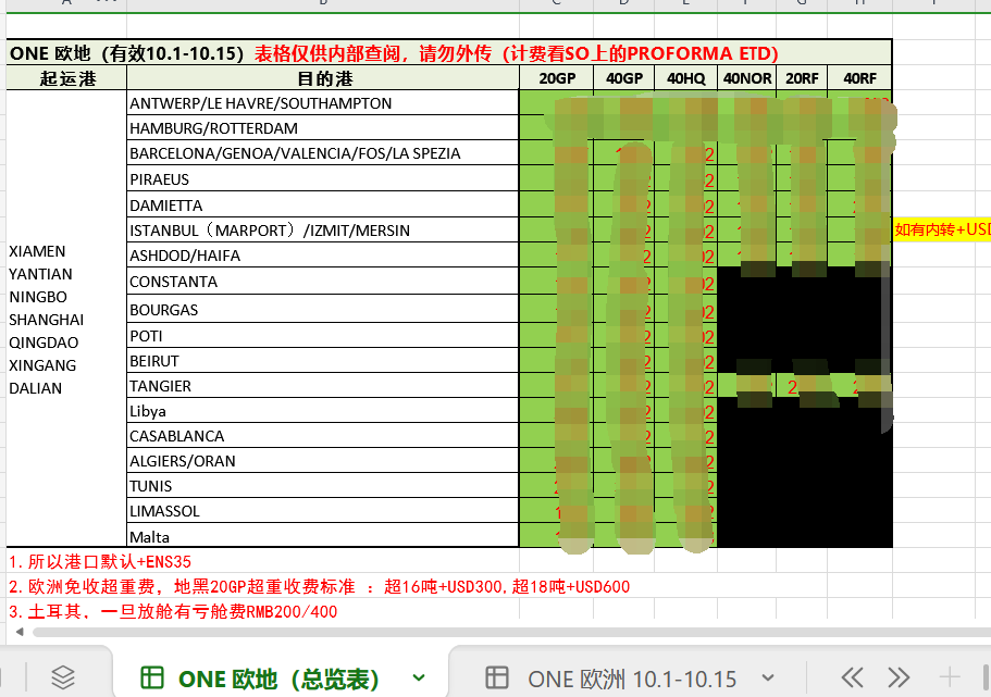 ONE 全国口岸到欧洲、地中海,一手舱位,正常船东单,20GP/40GP/40HQ /45HQ/40NOR/20RF/40RF 都可以放舱,我们公司舱位可以卖同行,有量有价,需要货量填充合约,欢迎广大同行咨询,长期合作的可以定期更新一手的价格和舱位情况。