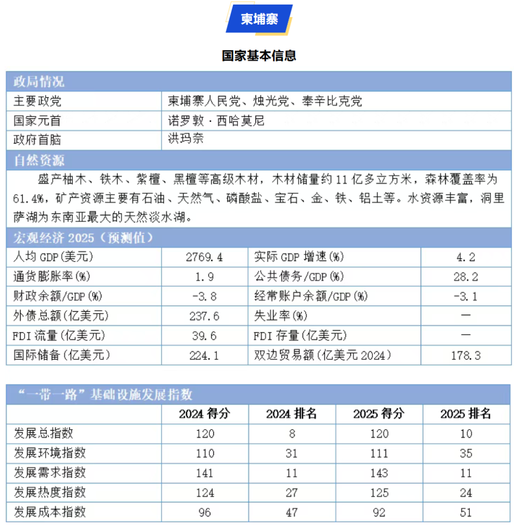 2025年柬埔寨基础设施发展指数得分为120,在“一带一路”共建国家中排名第10位,较2024年下降2位。柬埔寨政治局势相对稳定,经济高度依赖成衣制造、旅游业和农业,经济结构单一,易受全球需求波动影响。